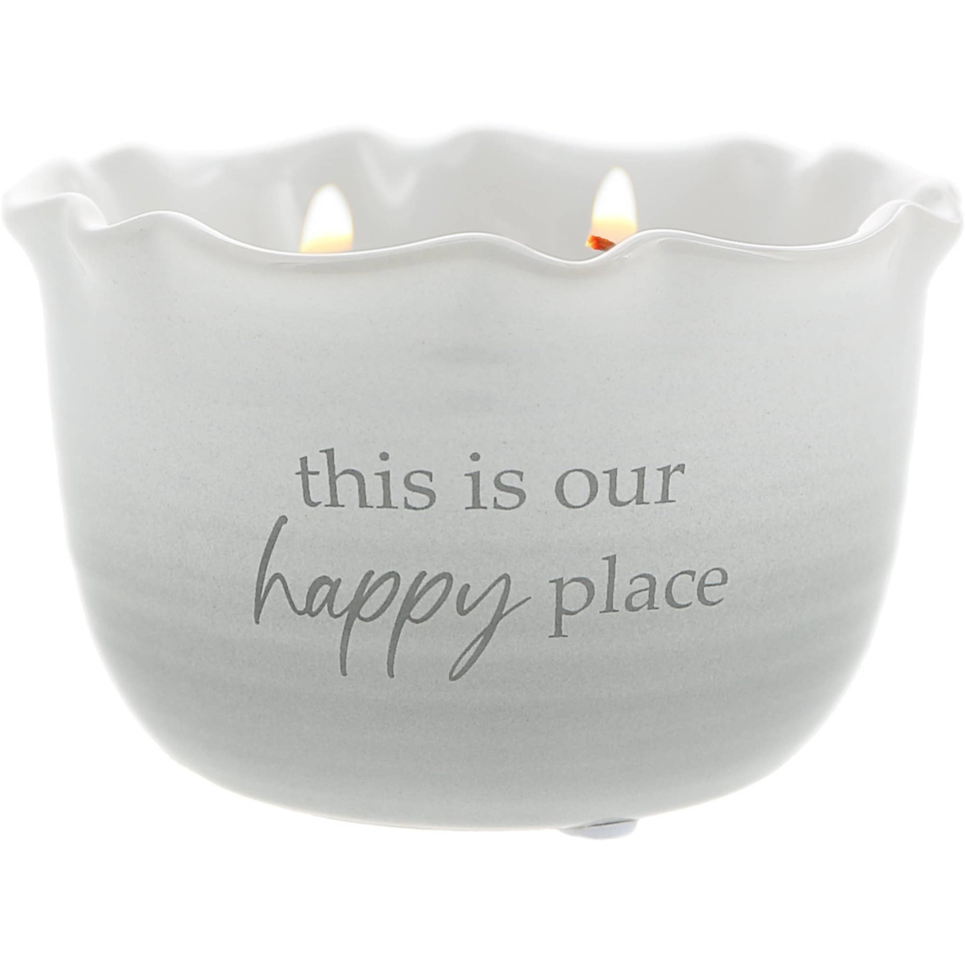 This 11 oz 100% soy wax jasmine tranquility-scented candle fills an organic-shaped ribbed ceramic vessel that will fit into modern neutral-styled homes. The double lead & nickel-free cotton wicks provides a smooth burn when each wick is cut down to 1/4" after burning. The candle will burn for 27-30 hours total. Once the candle has burned away, repurpose this as a jar to hold keys or desk items such as paper clips, push pins, or pens. Even reuse as a bathroom cotton ball, q-tip, toothpick, or bobby pin holder; coin & change holder too. The new & innovative candle offers a unique message for your loved one within the wax as time progresses. You will see cursive written "Forever Happy" sentiment after about 10 minutes. As you watch, the entire decal will appear after 60 minutes. Then, the message will hide again and reappear with each burn. The front of the candles has a simplistic "This Is Our Happy Place" decal accompanied by an ombre white & gray pattern.