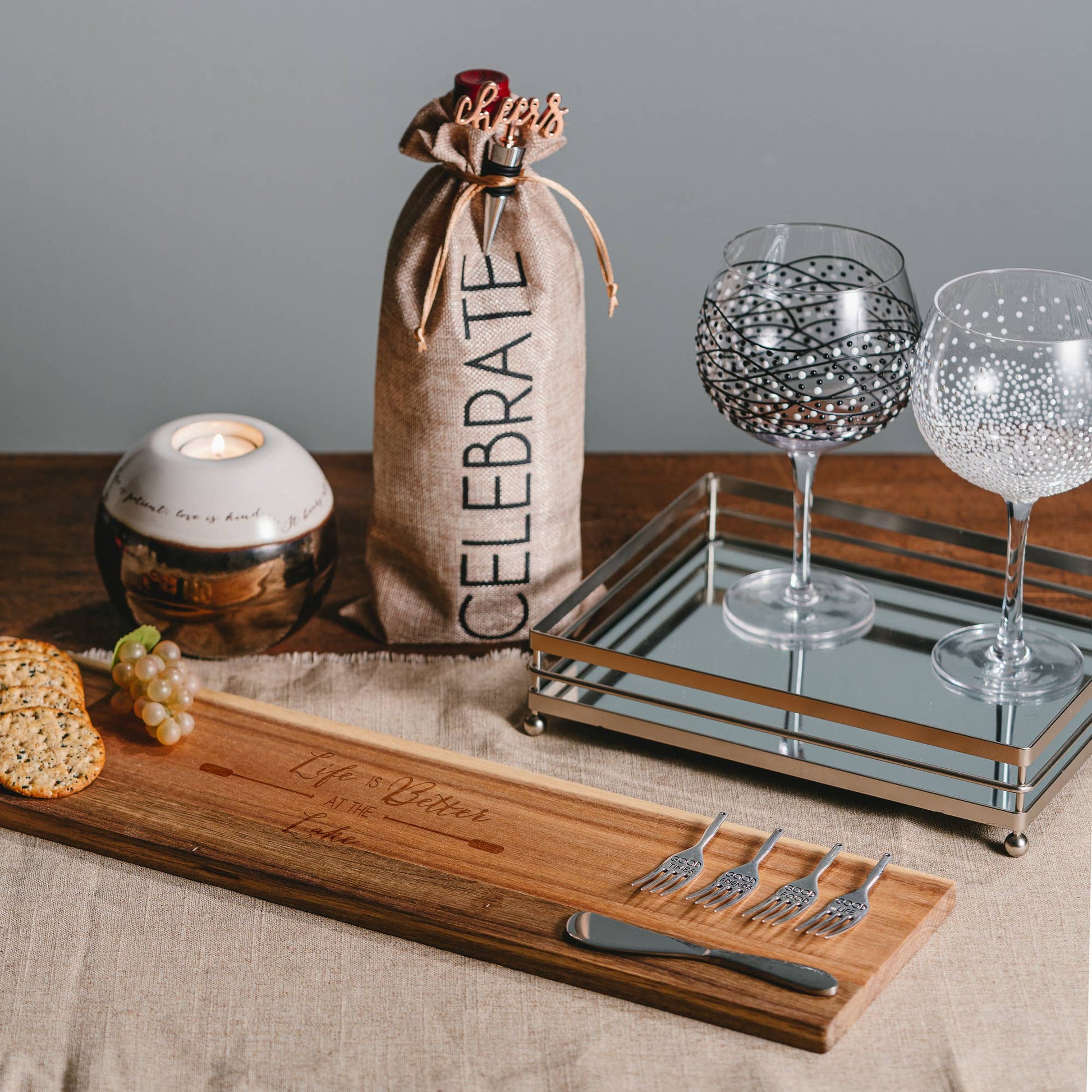 21" serving board, packaged in a printed acetate box, is made from Prop 65-approved acacia wood and includes one spreader and four forks, made from metal alloy. "Life Is Better At The Lake" text is laser engraved into the top of the serving board. Accompanying forks feature engraved "Good Times", "Good Food", "Good Friends", "Good Life" texts. Board, forks, and spreader are hand wash recommended. To properly season, slightly warm a food-grade mineral oil then dab the oil on a clean, dry cloth. Apply the oiled cloth to the board in the direction of the grain. Great for gifting to those who wish to show their love of the lake.
