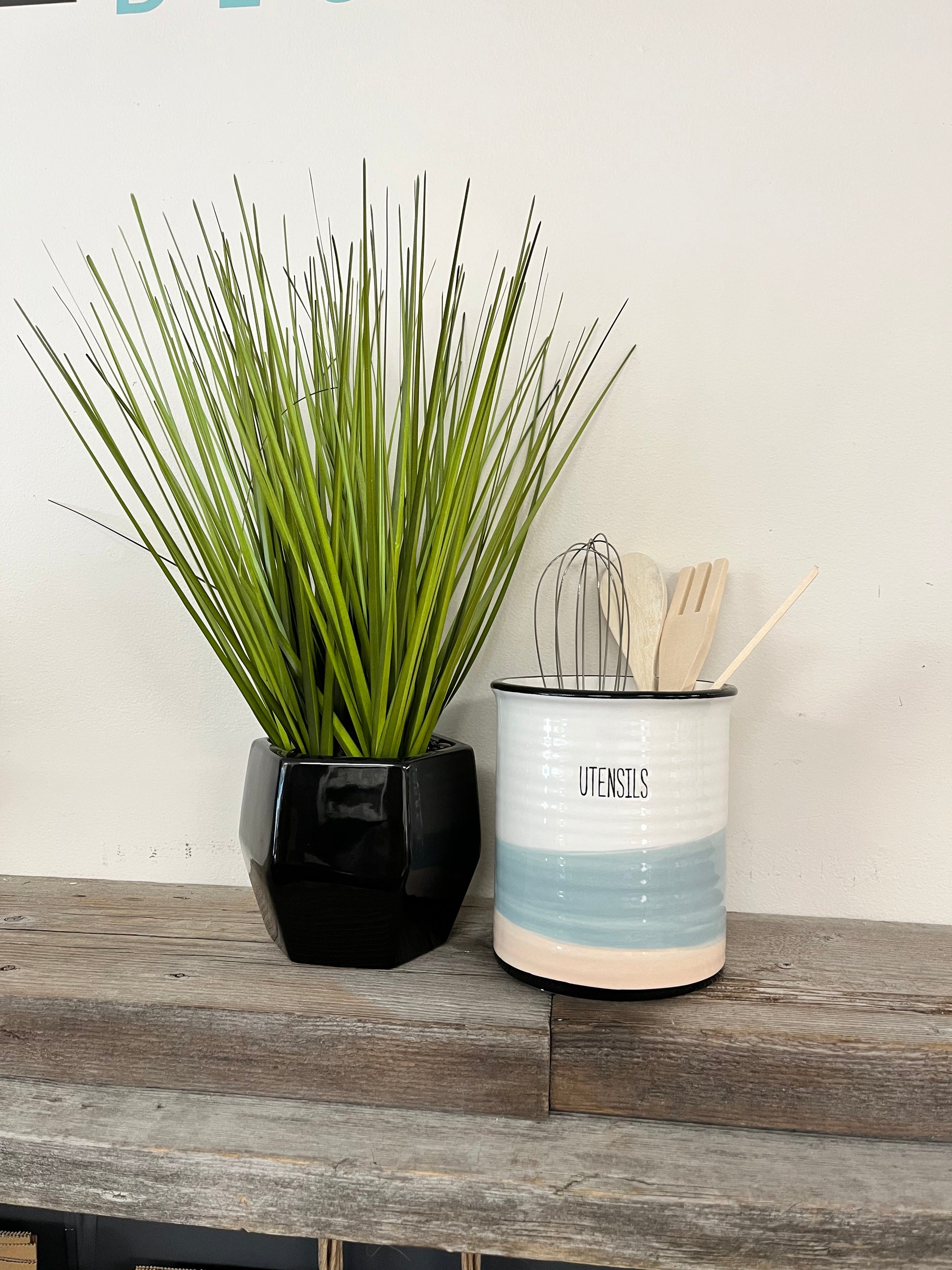 This ceramic utensil set combines functionality with vibrant multi-colored design, measuring 6 inches tall and 5 inches wide. Its sturdy construction ensures durability, while the compact size makes it ideal for kitchen counters or dining areas. Perfect for organizing and elevating your culinary space with both style and convenience. Set includes wooden spoon, spatula, fork and metal whisk.