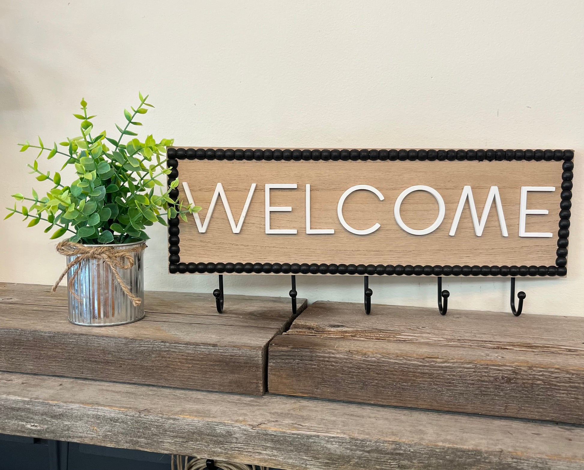 Elevate your entryway with this expertly crafted "Welcome" wood sign featuring sturdy hooks. Designed for both style and function, it offers a warm greeting while providing convenient storage for keys, coats, or bags. Its durable construction ensures lasting use, making it an ideal addition to organize and enhance your home’s first impression.